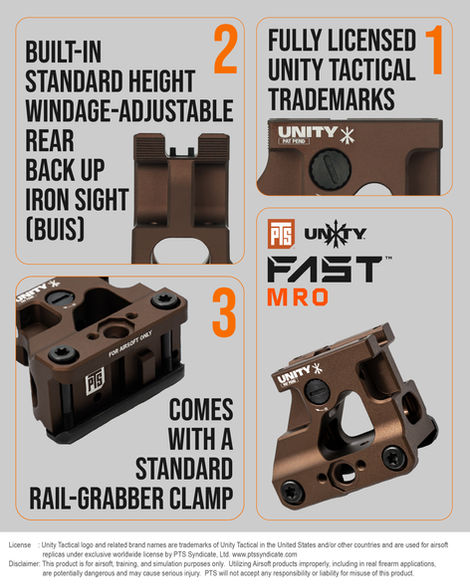 Unity Tactical FAST™ is a series of optic mounts that provide end users with a quicker sight picture than standard height mounts. The PTS Unity Tactical FAST™ MRO Mount is precision manufactured from black anodized 6000 series Aluminum Alloy and features a built-in standard height windage-adjustable rear back up iron sight (BUIS) that keep your airsoft guns uncluttered without reducing its capability. It also features the FAST™ offset accessory mounting interface. The PTS Unity Tactical FAST™ MRO Mount compatible with all PTS Unity Tactical FAST™ FTC (Flip-To-Center) Magnifier Mounts.